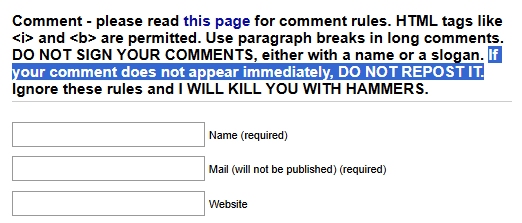I feel it is incumbent upon me to warn those who find themselves, perhaps in a confused daze, perpetually sniffing around my comments in fevered excitement desperate to engage my attention that they have been sexually imprinted by various special word combinations and patterns peppered throughout my posts.