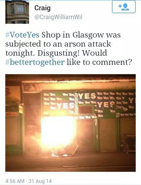 ok, I have dug around a bit, the shop on fire in the images on twitter is on Eglington Street, according to google approx. number 469 on the A77. If you use google streetview, you will see it being used as of May 2014, the location to help you since google’s addressing is a bit suspect, it’s just to the west of Cardwell Street on the south side of the street. Someone else will have to investigate further, however it has been suggested it wasn’t a Yes shop but a derelict shop covered in Yes posters. If so it must have been abandoned since May 2014.