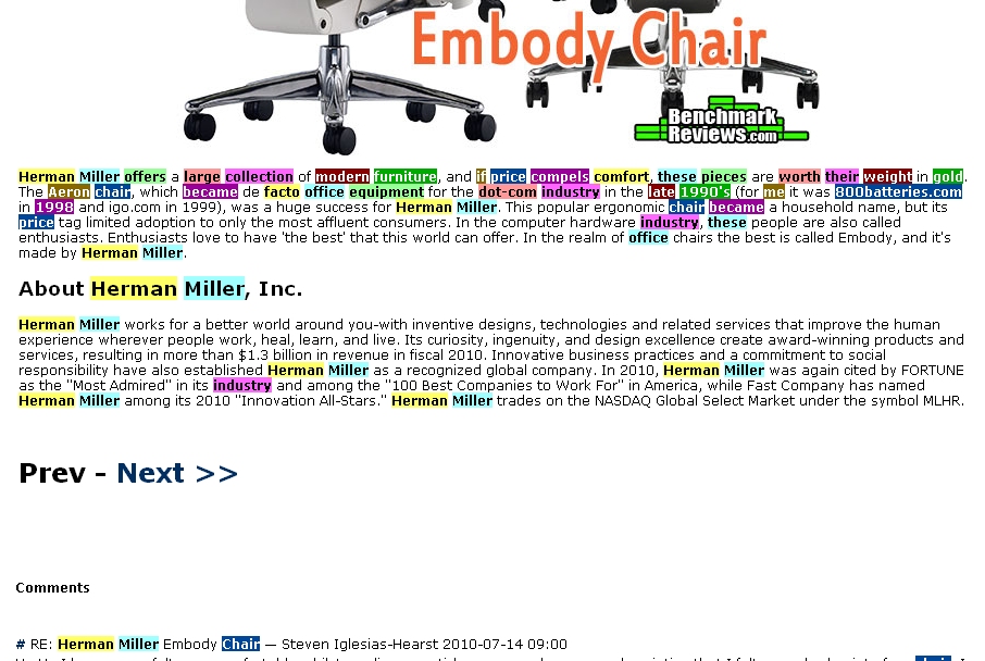 It's obvious enough from the initial paragraphs that it's an example of co-back-scratching article-writing simply because of how many times it uses the phrase "Herman Miller" and "Herman Miller's Embody Chair". Hoorah for keyword-spamming your way into a positive position on Google.