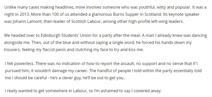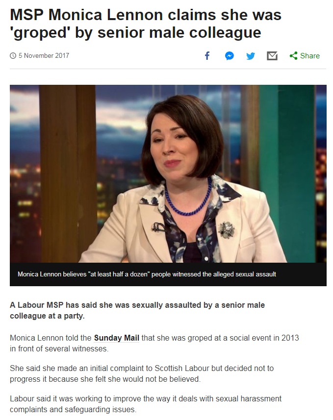 What a bunch of sneaky wee hypocrites. Aamer Anwar has stated that numerous complaints had been made to him about male politicians from all political parties at Holyrood. I take it that includes the Tories, Labour and Libdems? So who are they?