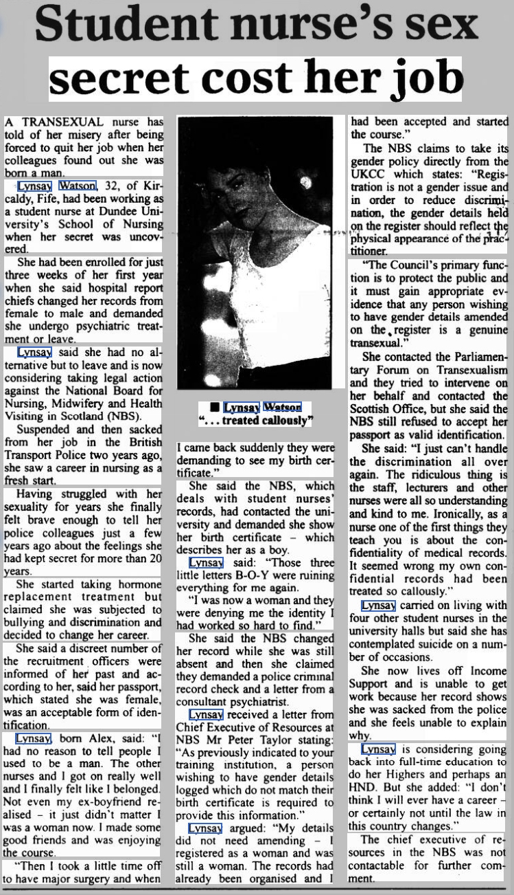 After being kicked out of the cops, the newly-renamed Watson (seemingly after having had sex-change surgery in the intervening period) tried in 1999 to become a nurse without disclosing that he was male. After being asked to provide the nursing board with details of his psychiatric or criminal records, both of which he refused to do, he chose to leave the nursing course he’d been on at Dundee University.