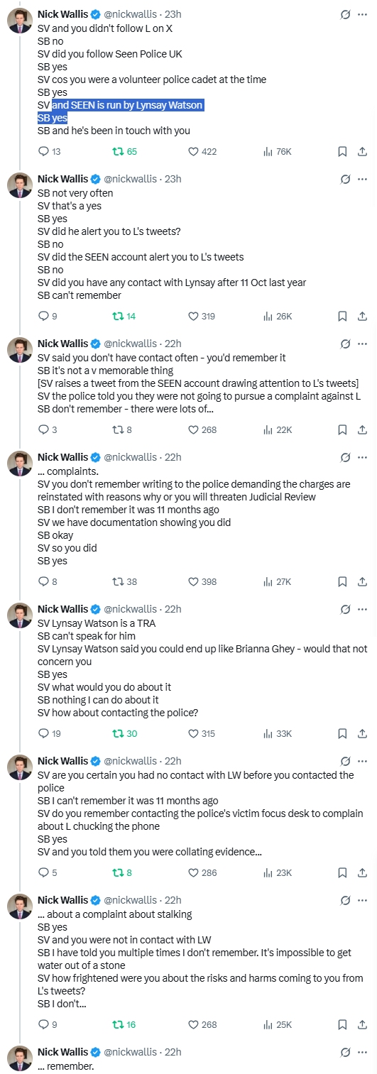 The alleged “victim” of Linehan’s “assault” is an 18-year-old trans-identifying male activist calling himself Sophia Brooks, but better known to gender-critical campaigners as “Tarquin”. Nick Wallis’s reporting of his cross-examination by defence counsel Sarah Vine (SV in these tweets) reveals the startling degree of influence exerted by Lynsay Watson over the teenager, from an initial contact where Watson shockingly told him he could end up murdered like Brianna Ghey.
