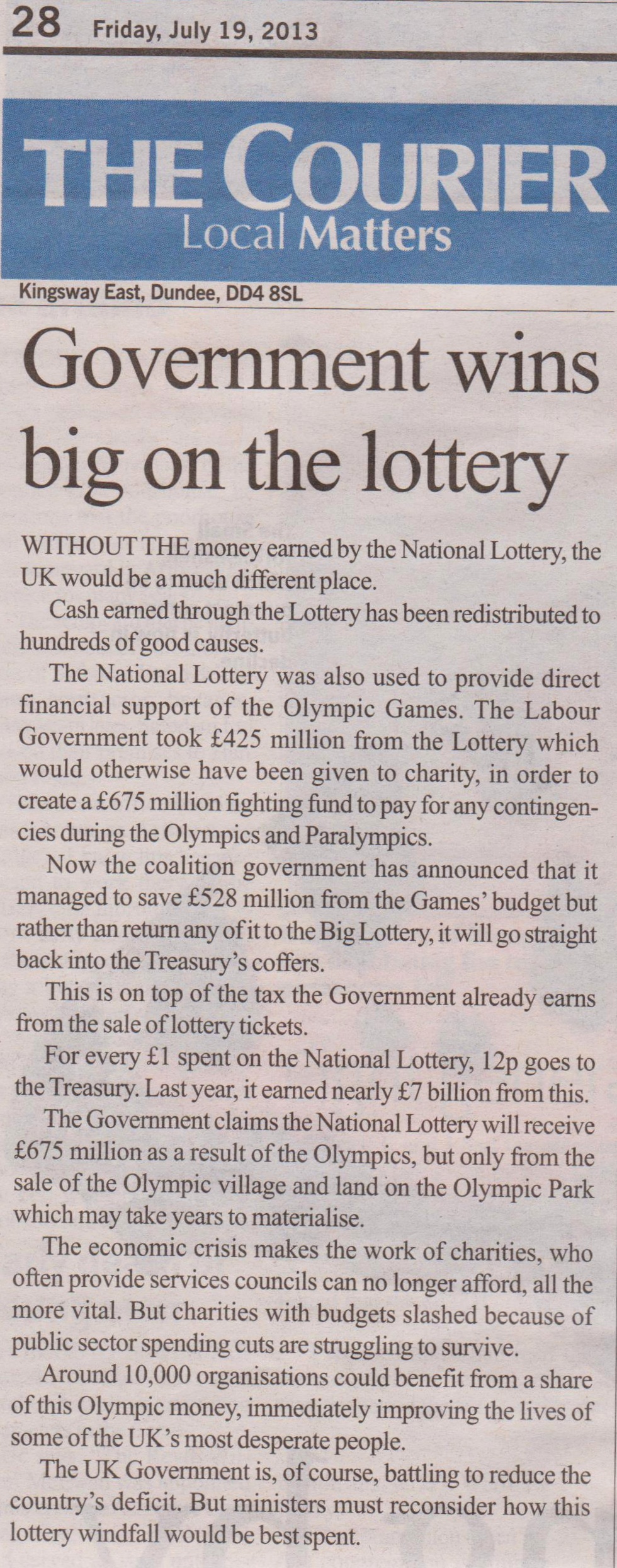 Other media coverage of the issue appears to have overlooked the lottery aspect entirely. Scottish charities’ share of the money the government has decided to hang onto would have been £44.3m. Have a nice evening, folks – we’re Better Together.
