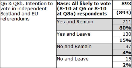 Interesting that Q6 & Q8b reveals that the strongest support for Independence comes from the group who voted to leave the EU.