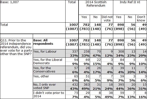 There’s also a perhaps unexpectedly large faction within the SNP support (15% in total) that used to vote Lib Dem or Tory, most of which is still firmly No.