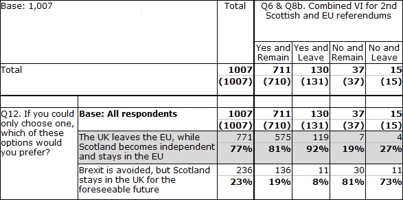 Equally weirdly, the figures were exactly reversed in the No+Remain group. Among those who want to stay in BOTH unions, almost 20% said they would would sacrifice the UK to keep Scotland alone in the EU, even though the alternative option was to stay in both, which is the outcome they prefer.
