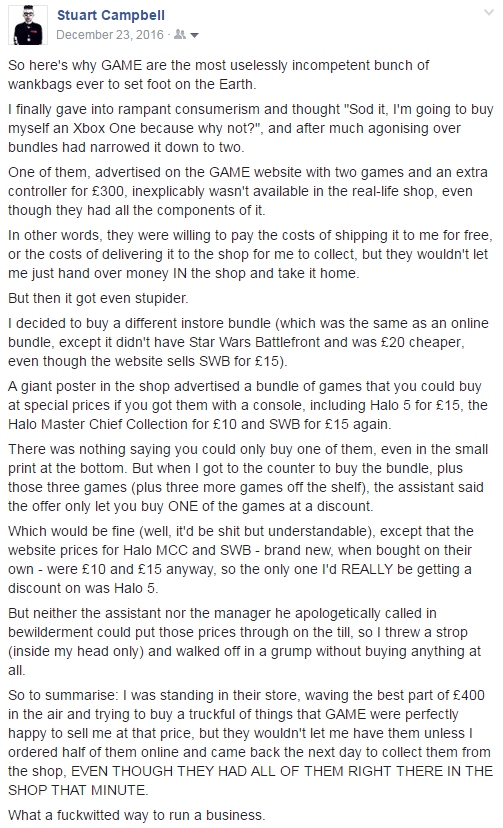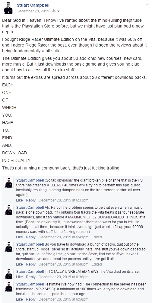 Yet on the 360 you could buy a game and be playing it within two minutes of getting into your house. Even if you were so unutterably stupid as to buy the digital version (almost certainly more expensive than a disc, but with zero portability or resale value), you'd be looking at a worst-case scenario of no more than a couple of hours with a humble basic copper-wired broadband connection.