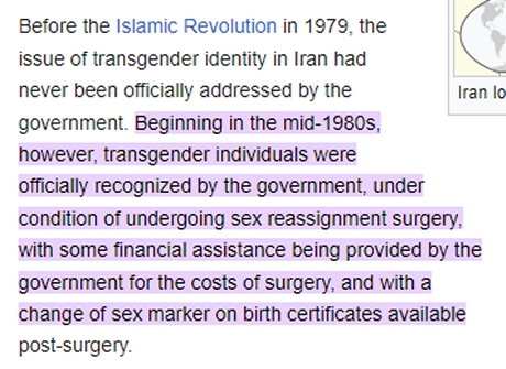 At the opposite end of the spectrum to Brazil we find Iran, a “trans-friendly” country where changing your sex is encouraged and even funded by the government as an ideologically-preferred alternative to homosexuality, which is still punishable by death.