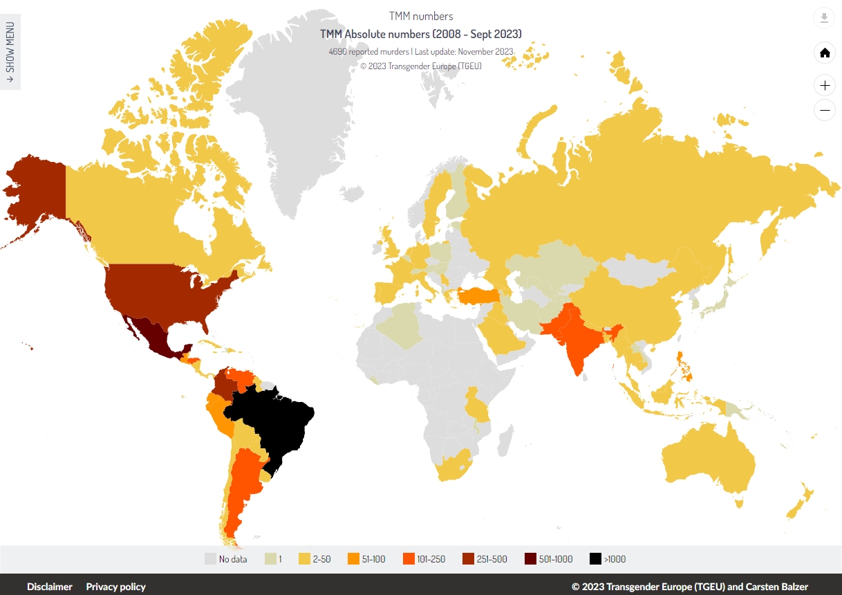 So to assess the magnitude of the problem let’s start with the clear world capital of trans murder, Brazil, which accounts for almost 40% of all recorded homicides against trans people.